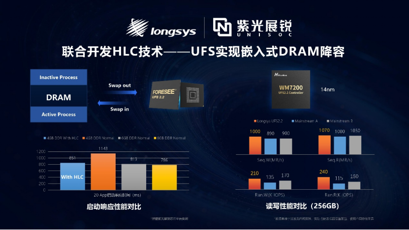 在嵌入式端,江波龙与紫光展锐联合开发,搭载紫光展锐芯片平台实测,4GB DDR搭配HLC技术后,20款App启动响应时间仅851ms,接近6GB/8GB DDR正常配置水平,且江波龙搭载14nm制程工艺WM7200主控的UFS 2.2产品,顺序读写最高可达1070MB/s、1000MB/s,随机读写IOPS分别最高可达240K、210K,超过行业主流水平,在保障流畅体验和器件使用寿命的前提下,有效降低终端DRAM容量需求、优化BOM成本。