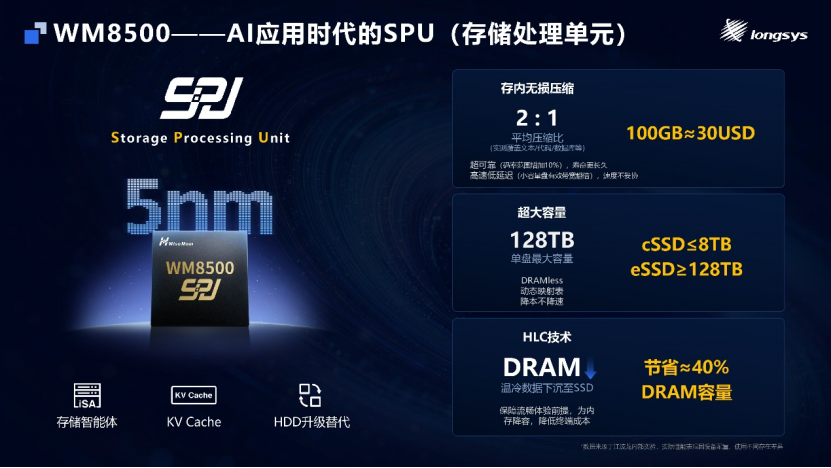 本次峰会上,江波龙重磅推出SPU(Storage Processing Unit,存储处理单元)与iSA(Intelligence Storage Agent,存储智能体),构建起“芯片硬件+智能调度”的端侧AI存储软硬件协同技术闭环。与常规SSD主控芯片不同,SPU是面向智能存储架构打造的专用处理单元,芯片基于5nm先进制程工艺打造,单盘最大容量达128TB,当前主流cSSD 容量最大仅至8TB,而大容量eSSD方案成本较高,SPU则有效平衡了容量与成本难题,可高效益替代HDD,为客户探索eSSD方案提供了新可能,同时有望显著降低整体拥有成本。SPU核心具备存内无损压缩、HLC(High Level Cache)高级缓存技术两大关键能力,存内无损压缩平均压缩比达2:1,实测覆盖文本/代码/数据库等多类数据,大幅节省SSD容量和成本;还能通过HLC技术实现温冷数据下沉至SSD,节省近40% DRAM容量需求。