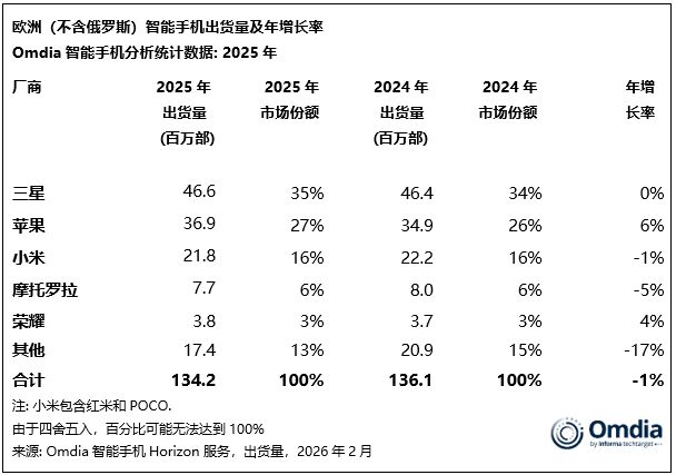 2025年欧洲智能手机市场经历动荡,全年出货量下滑1%至1.342亿部,主要受需求低迷及环保设计影响。USB-C新规的实施进一步加剧了市场波动,推动厂商调整产品策略。