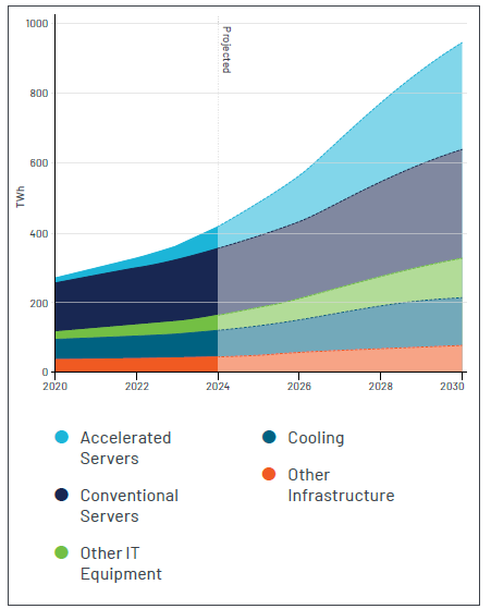 图1:展示了2020年至2030年间全球数据中心按设备划分的电力消耗增长趋势(基准情景)
