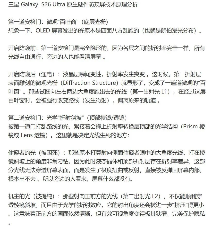与传统防窥膜或软件遮罩方案截然不同,三星的硬件级防窥屏技术基于显示Flex Magic Pixel硬件底层实现。通过双重光学结构构建底层微观光栅形成"百叶窗"效应,能够有效拦截大角度侧光并改变光路;同时,顶层棱镜阵列构成"折射斜坡",将侧方偷窥光线扭曲反射回屏内,仅允许正前方光线正常射出。这种设计在不影响屏幕观感的前提下实现了物理层面的隐私保护,且不会导致亮度损失或色彩偏移。