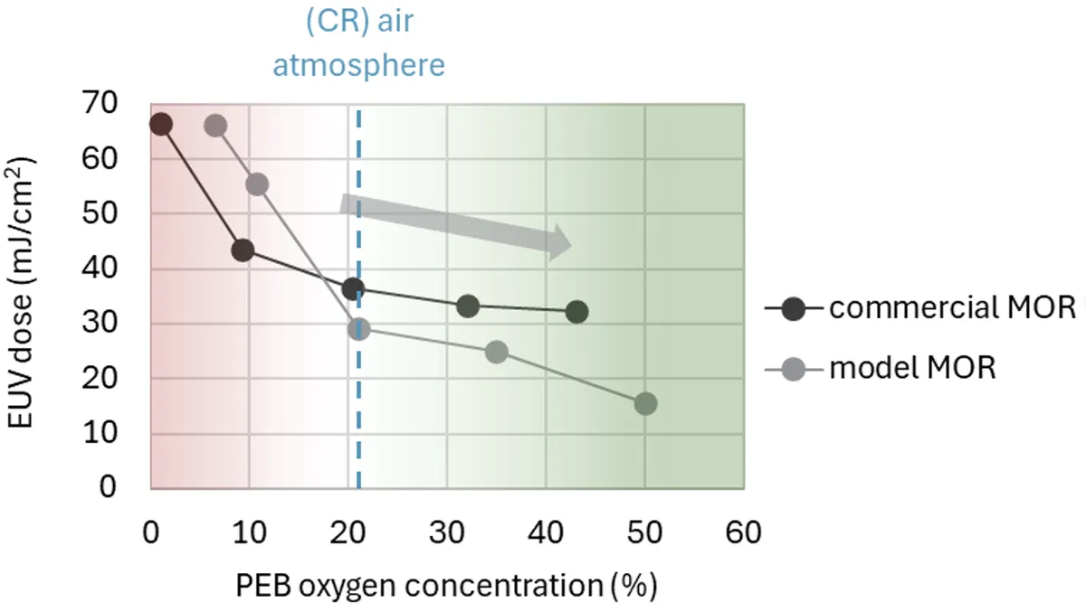(数据显示,当氧浓度高于空气环境中的 21% 时,所需的 EUV 曝光剂量出现显著下降)(图片来源:imec)