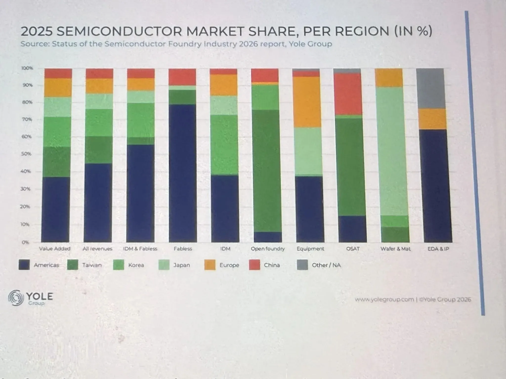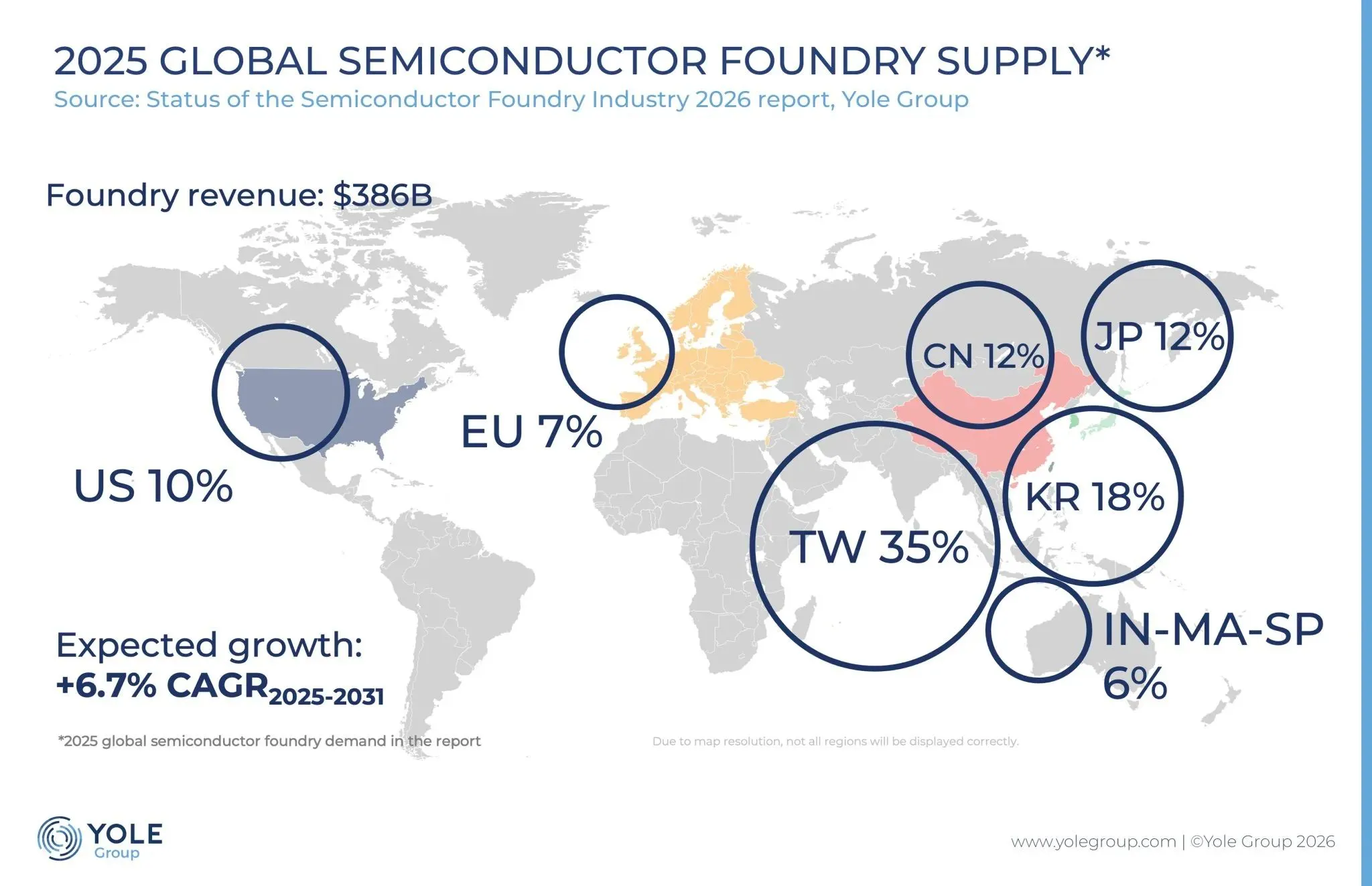 不过,由于产能过度投资,2025 年代工产能利用率降至 73%,且预测未来数年利用率将维持在 70% 至 75% 区间。2025 年,台积电全球半导体制造营收市占率提升至约 32%,在晶圆代工领域的市占率则达到 68%。中国正快速扩产,到 2031 年有望占据全球晶圆代工产能的 30%。