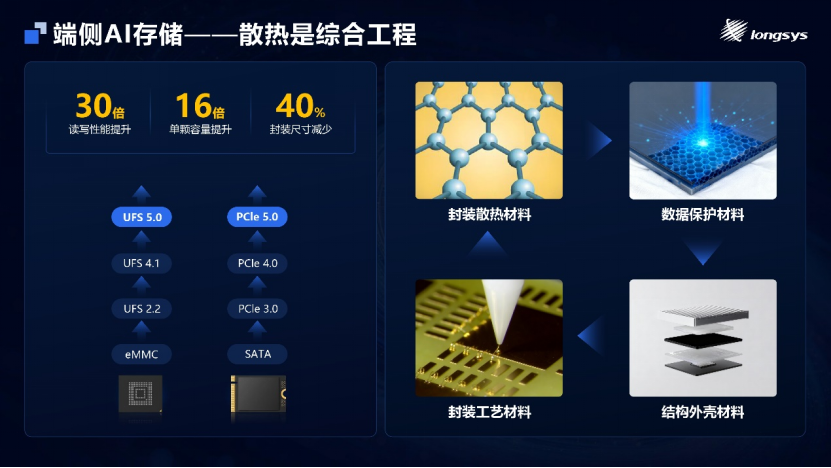 端侧AI存储的发展高度依托材料工程能力,其中散热材料更是核心技术挑战,考验综合能力。从技术路线来看,嵌入式存储从eMMC迭代到UFS 5.0,SSD从SATA演进至PCIe 5.0,它们的核心升级方向都指向三点:读写性能更快、单颗容量更大、封装尺寸更小。而要实现这三大升级,离不开四大关键材料综合工程的创新支持: