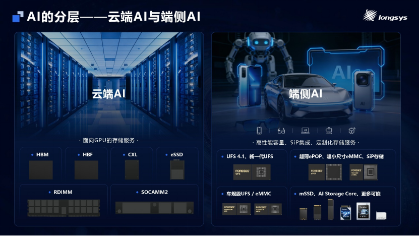 演讲开篇从AI产业分层发展格局出发,清晰划分云端与端侧AI的存储服务核心差异:云端AI聚焦面向GPU的专业化存储服务,而端侧AI则围绕高性能容量、SiP系统级集成封装、定制化服务三大核心需求展开,其对存储的要求与过往标准存储生态存在本质区别。正如消费级GPU与AI专用GPU分属截然不同的体系,前者依托通用芯片生态,后者面向完整AI系统产品打造,端侧AI同样需要深度集成的定制化存储方案,而非通用标准存储产品。基于这一精准定位,江波龙聚焦端侧AI集成存储解决方案,精准匹配AI手机、AI辅助驾驶、AI穿戴、AI PC、具身机器人等多元场景,为端侧AI存储创新锚定清晰的场景导向,与云端AI存储形成优势互补。