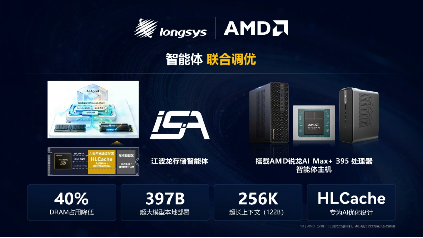 作为SPU的大脑,iSA存储智能体是面向端侧AI推理的智能调度引擎。针对MoE大模型参数庞大、KV Cache膨胀快、I/O延迟影响推理流畅度等问题,通过MoE专家卸载、KV Cache智能管理与智能预取算法,高效解决端侧AI推理的存储调度难题。江波龙与AMD基于锐龙AI Max+ 395处理器的智能体主机开展联合调优,实现397B超大模型本地部署,在256K超长上下文(122B)场景下,将DRAM占用降低近40%,为超大模型本地化高效部署与规模化应用提供了创新的实践方案。未来,双方将充分发挥各自技术与生态优势,持续深化在智能体领域的协同创新。