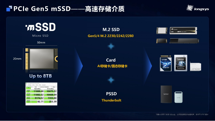 正是在这样的技术方向与底层能力支撑下,继2025年推出PCIe Gen4 mSSD之后,江波龙带来新一代高速存储介质PCIe Gen5 mSSD。产品保持DRAM-less与20×30mm超小尺寸设计,且兼容M.2 2230规格,并可灵活拓展衍生为 M.2 2242/2280、AI/固态存储卡、PSSD等多形态规格,客户无需更改原有设计即可直接兼容,灵活实现多形态、高性能、大容量的全方位创新。同时,PCIe Gen5 mSSD搭载联芸1802主控芯片,并带来了全方位升级:顺序读写性能最高可达11GB/s、10GB/s,随机读写性能最高可达2200K、1800K IOPS,单盘容量最高支持8TB,其特性精准适配AI PC等端侧AI设备对高速、大容量的存储需求。