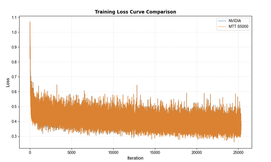 精度稳定对齐方面,大模型训练的核心诉求在于算力规模、性能、稳定性及最终模型质量。在FlagOS统一调度下,MTT S5000集群采用完全对齐的数据集和训练参数,Loss收敛曲线与国际主流产品基线高度一致,平均相对误差控制在0.82%以内。同时,在标准下游任务评测中,基于MTT S5000训练的模型表现比行业标杆基线高出1.65个百分点。这表明开发者基于公开模型结构与数据集,即可在国产算力平台上获得与国际主流平台精度相当的效果,部分指标更优。此外,今年1月,MTT S5000千卡智算集群已完成智源自研具身大脑模型Rob