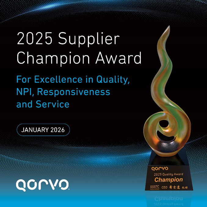 全球领先的连接和电源解决方案供应商 Qorvo(纳斯达克代码:QRVO)宣布荣获建兴储存科技公司(SSSTC)颁发的“电源类供应商冠军奖”。该奖项每年授予在SSSTC质量评估中表现最为出色的供应商。