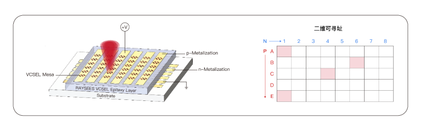 二维可寻址VCSEL正是这场革命的答案。该技术能够将发光芯片划分为众多独立可控的像素单元,实现对每个发光点的开关、功率和时序的精准编程,也是推动高线数雷达实现可靠量产的核心技术。