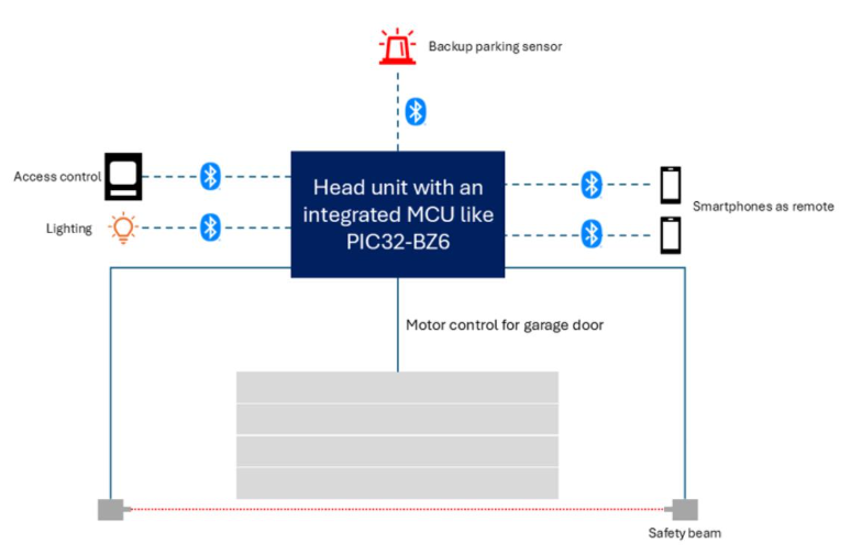 以现代车库门系统为例,其设计不仅要求安全的无线连接、精确的电机控制和友好的用户界面,还需兼顾紧凑性和成本效益。像 Microchip 的 PIC32-BZ6 这样高度集成的无线 MCU,凭借大容量存储和多协议无线操作,能够全面满足这些需求。其中,蓝牙低功耗(BLE)可用于远程访问,2 MB闪存和 512 KB RAM 的高存储集成支持先进的控制算法。多路脉宽调制(PWM)、高分辨率 ADC 及 QEI 集成,实现了精确的电机操作、传感器反馈和可靠的位置追踪。此外,集成的触摸和图形功能可实现直观的键盘和显示界面。像 PIC32-BZ6 这样的单芯片解决方案能够简化硬件设计,缩小 PCB 尺寸,降低整体系统成本,非常适合新一代车库门应用。