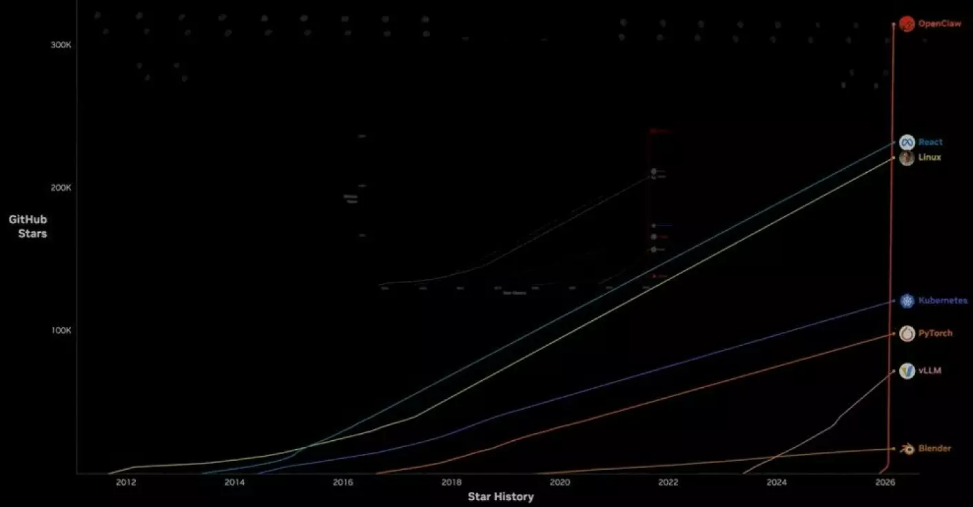 OpenClaw的崛起速度在软件领域堪称奇迹。这款智能体AI个人助手最初于2025年底亮相,经历了"Clawdbot"和"Moltbot"的更名阶段,直到今年1月正式定名为OpenClaw后,才真正开始爆发式增长。仅用不到四个月时间,该项目在GitHub上就斩获超过25万星标,超越了长期领先的React,成为星标最多的非聚合类软件项目,期间还创下单周浏览量超200万次的惊人纪录,其增长曲线几乎呈垂直上升状态。